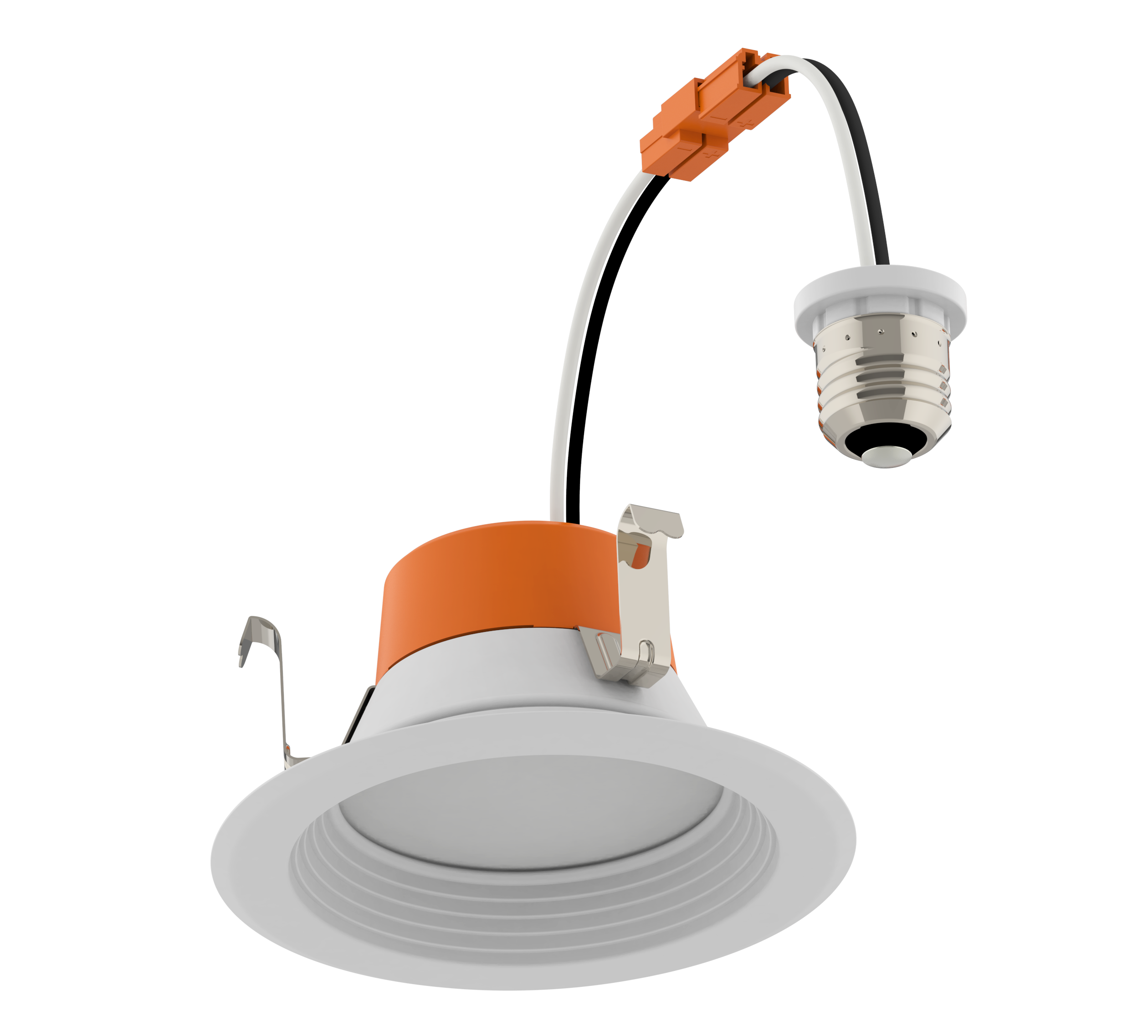 • Integrated white trim, E26 medium base socket adapter