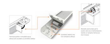 Terminali apribili e richiudibili senza attrezzi per accedere ai connettori elettrici. Connettori elettrici che non richiedono attrezzi . Morsetto premontato per lo scarico del cavo di alimentazione tramite un semplice fermacavo (non incluso)