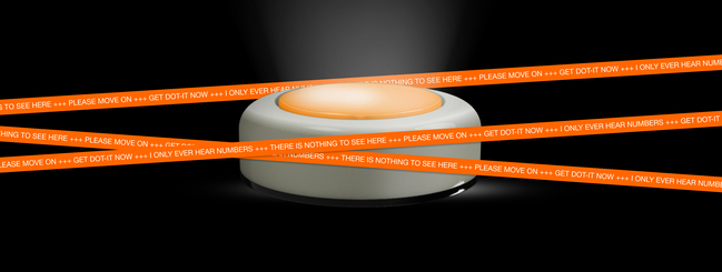 DOT-IT in blue on book on bedside table during day partly hidden