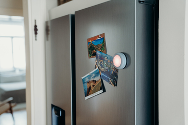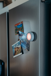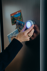 Person turning DOT-IT on Fridge with postcards