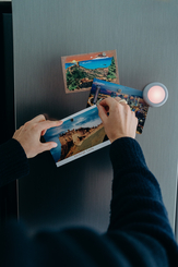 Person fixing postcards on fridge next to DOT-IT