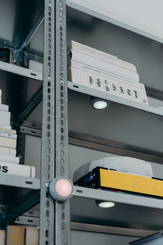 Close-up of Dot-It on metal shelf with book