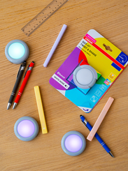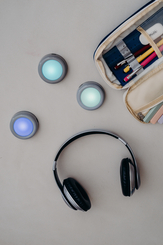 Three DOT-IT next to headphones and writing utensils on table