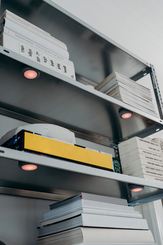 Metal Shelf with Books and magazines and small lights from below