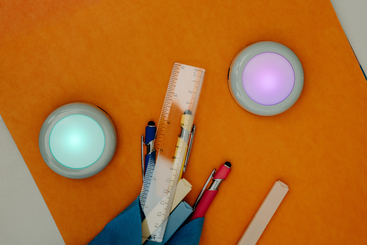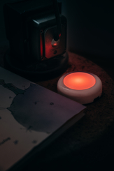 DOT-IT at Night on bedside table Close-Up in orange