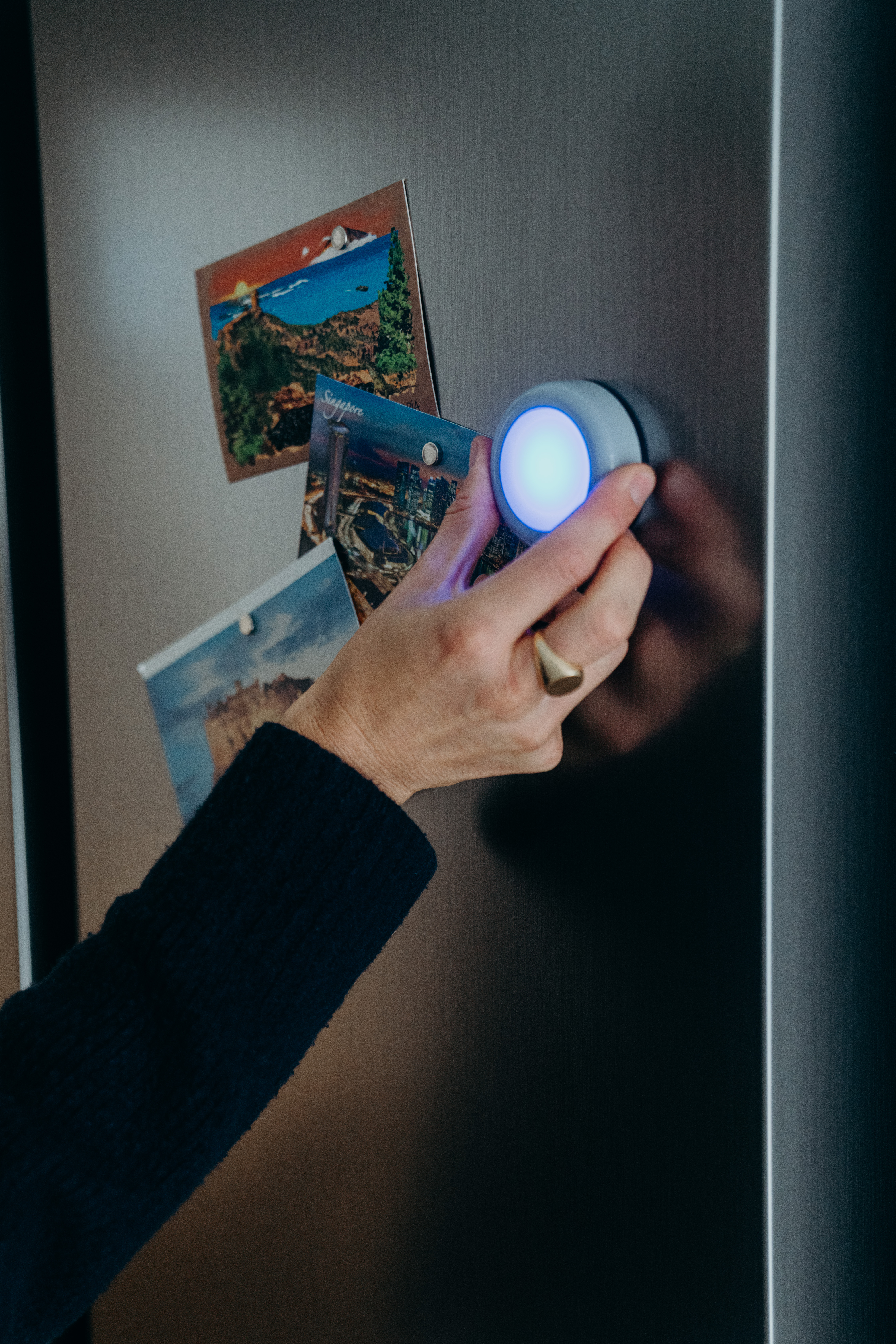 Person turning DOT-IT on Fridge with postcards Close-up