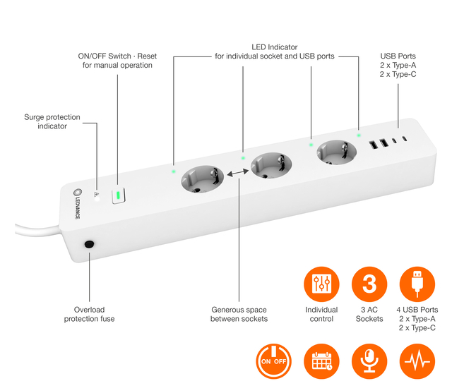 De LEDVANCE SMART+ WiFi Multi Power Socket EU is een slimme stekkerdoos met eenvoudige bediening van verschillende apparaten via drie slimme stopcontacten en slimme USB-A en C poorten. Bovendien kan de Multi Power Socket ook eenvoudig via een wifi-verbinding worden aangestuurd en zo in bestaande apparaten in een smart home-systeem worden geïntegreerd. De stekkerdoos voldoet aan hoge veiligheidsnormen tegen overbelastingsbeveiliging, overspanningsbeveiliging en de ingebouwde energiemeter bewaakt het energieverbruik van de aangesloten apparaten en houdt het energieverbruik bij. Het apparaat integreert conventionele elektrische apparaten in