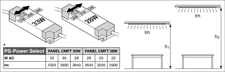 LEDVANCE PANEL COMFORT heeft een lichtopbrengst tot 130 lm/W en maximaal 4.320 lumen voor hoge energie-efficiëntie-eisen. De Power Select (PS) schakelaar op